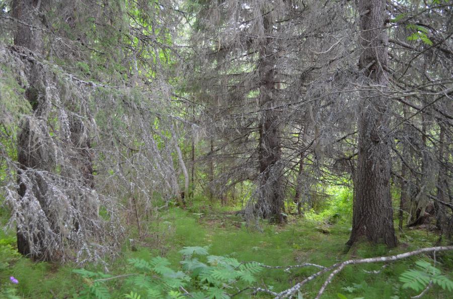 #1877 Место нашей второй стоянки. Сквозь верхушки деревьев виден останец "Старик Хозяин" -
